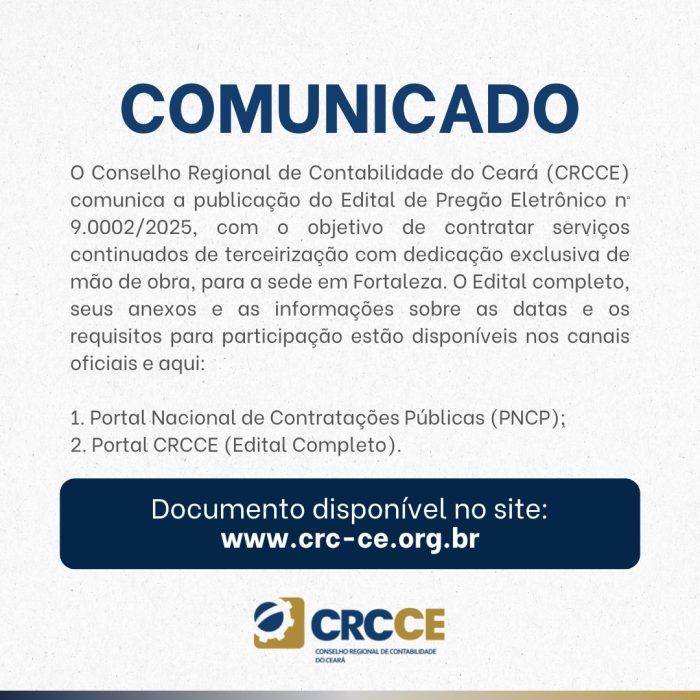 O Conselho Regional de Contabilidade do Ceará (CRCCE) comunica a publicação do Edital de Pregão Eletrônico nº 9.0002/2025, com o objetivo de contratar serviços continuados de terceirização com dedicação exclusiva de mão de obra, para a sede em Fortaleza . O Edital completo, seus anexos e as informações sobre as datas e os requisitos para […]