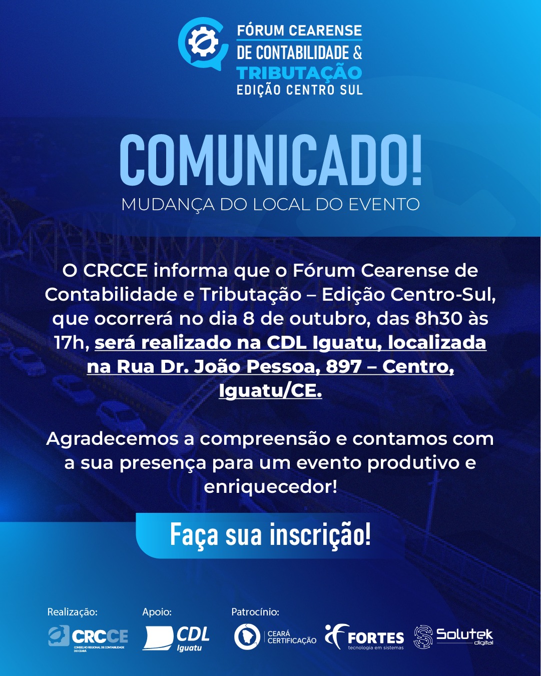 Comunicado: mudança de local do Fórum Cearense de Contabilidade e Tributação – Edição Centro-Sul