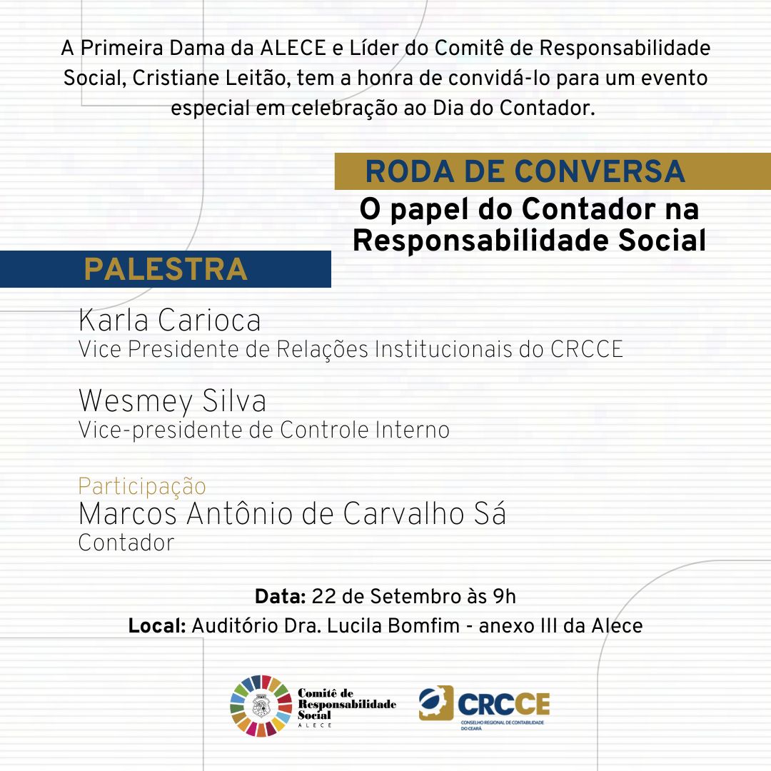 O Conselho Regional de Contabilidade do Ceará e a Assembleia Legislativa do Estado do Ceará têm a honra de convidá-lo(a) para um evento especial em celebração ao Dia do Contador. Junte-se a nós para uma enriquecedora roda de conversa sobre o papel do contador na responsabilidade social, com palestra de: