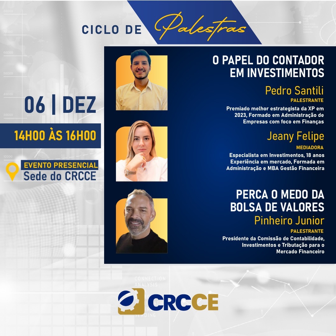 O CRCCE e a Comissão de Contabilidade, Investimentos e Tributação para o Mercado Financeiro realizarão o Ciclo de Palestras nesta quarta-feira (06/12), das 14h00 às 16h00, no 📍Auditório do CRCCE (Av. da Universidade, 3057, Benfica, Fortaleza-CE).