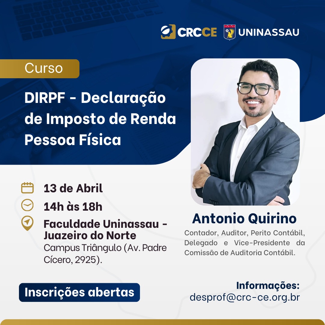 O CRCCE realizará o Curso: DIRPF – Declaração de Imposto de Renda Pessoa Física. O treinamento será presencial e ministrado pelo Contador, Auditor, Perito Contábil, Delegado e Vice-Presidente da Comissão de Auditoria Contábil e da Comissão de Contabilidade Aplicada ao Terceiro Setor, Antonio Quirino.