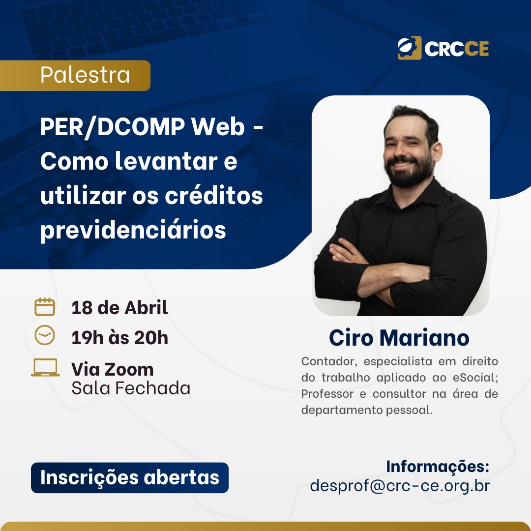 O CRCCE realizará a Palestra: PER/DCOMP Web – Como levantar e utilizar os créditos previdenciários. O treinamento será online e ministrado pelo Contador, especialista em direito do trabalho aplicado ao eSocial, Professor e consultor na área de departamento pessoal, Ciro Mariano.