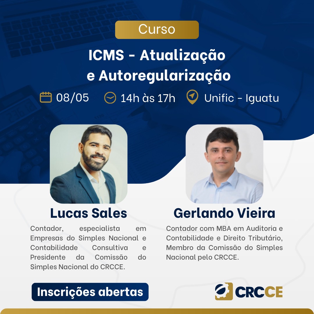 O CRCCE realizará o Curso: ICMS – Atualização e Autorregularização. O treinamento será presencial e ministrado pelo Contador, especialista em Empresas do Simples Nacional e Contabilidade Consultiva e Presidente da Comissão do Simples Nacional do CRCCE, Lucas Sales e pelo Contador com MBA em Auditoria e Contabilidade e Direito Tributário, Membro da Comissão do Simples Nacional pelo CRCCE, Gerlando Vieira.