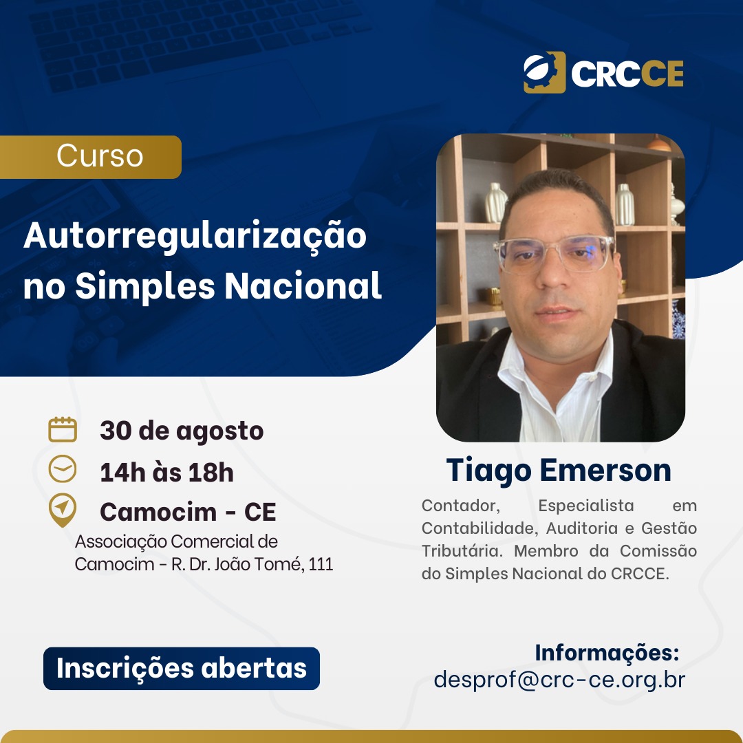 O CRCCE realizará o Curso sobre Autorregularização no Simples Nacional. O treinamento será presencial e ministrado pelo Contador, Especialista em Contabilidade, Auditoria e Gestão Tributária, Membro da Comissão do Simples Nacional do CRCCE, Tiago Emerson.