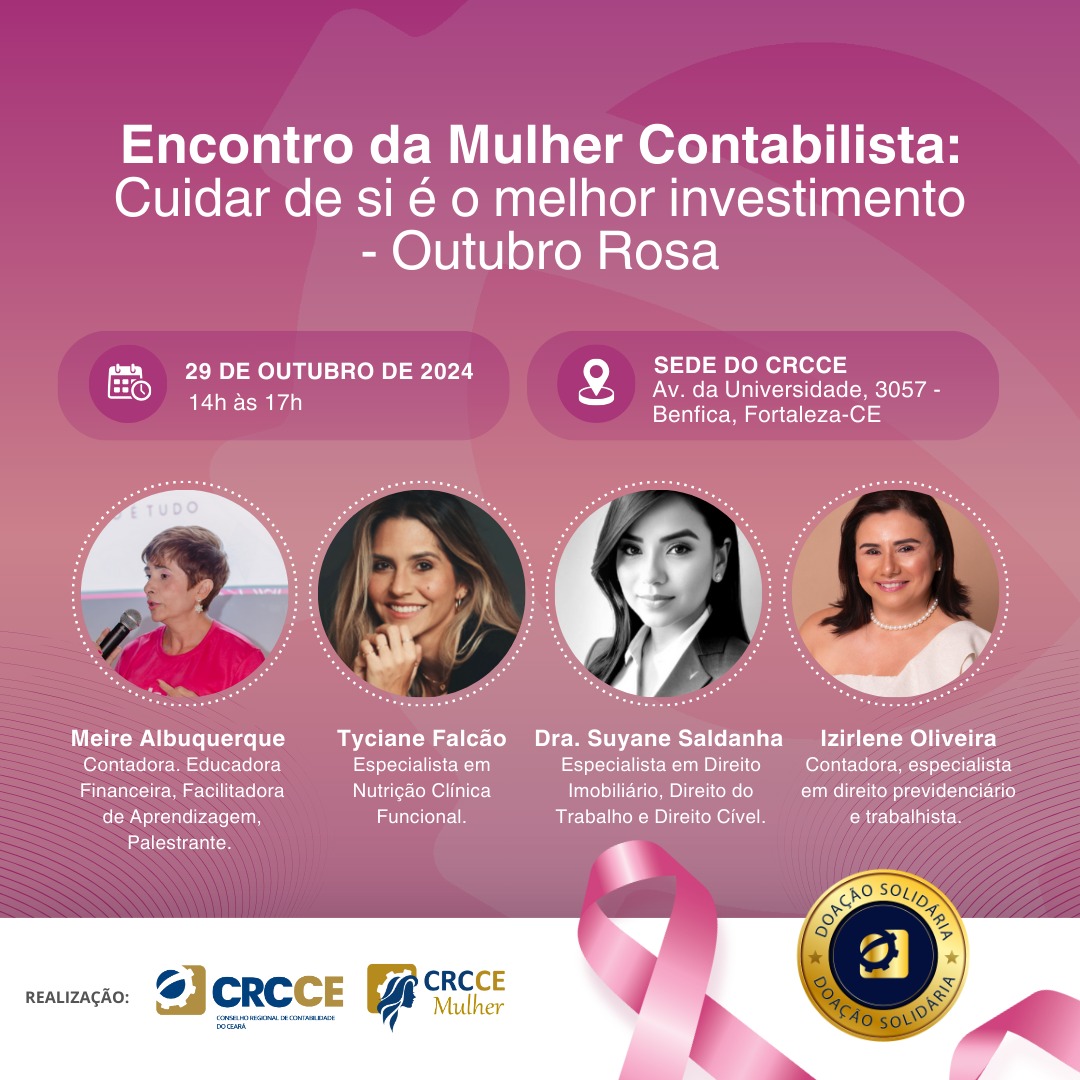 🌸✨ Você é nossa convidada para o Encontro da Mulher Contabilista: “Cuidar de si é o melhor investimento”, em alusão ao Outubro Rosa! No dia 29 de outubro, das 14h às 17h, estaremos reunidas na sede do CRCCE para um evento especial que valoriza a saúde e o bem-estar das mulheres.