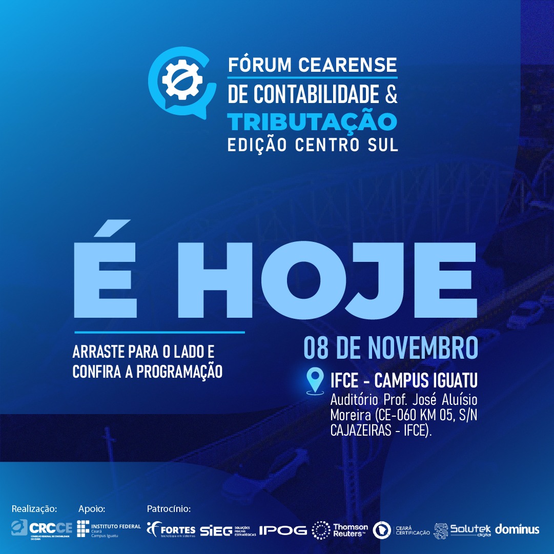 O Fórum Cearense de Contabilidade e Tributação – Edição Centro Sul, ocorrerá no IFCE – Campus Iguatu (Auditório Prof. José Aluísio Moreira), a partir das 13h.