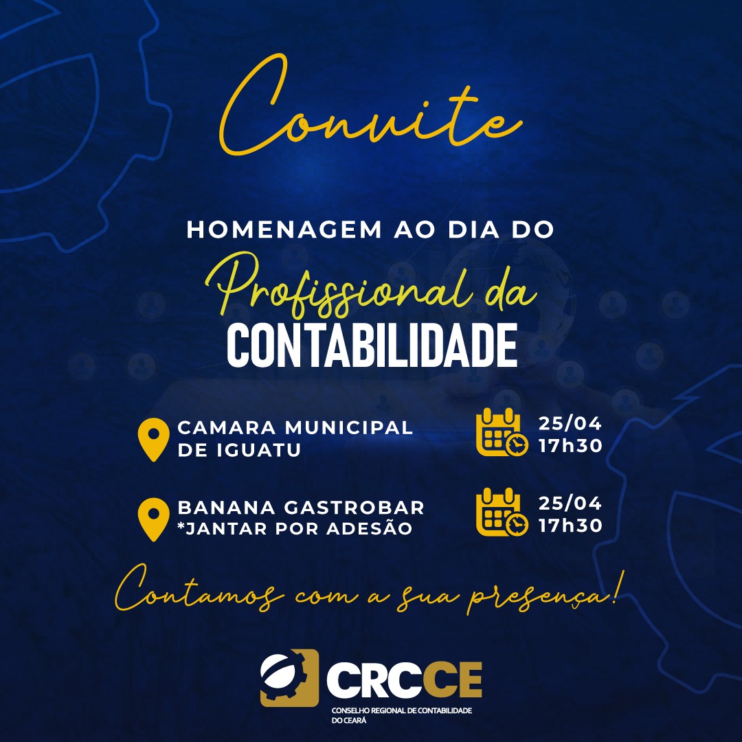 Em comemoração ao Dia do Profissional da Contabilidade, o Conselho Regional de Contabilidade do Ceará e a Delegacia do CRC em Iguatu convidam você para participar da Tribuna Livre e também de um jantar (por adesão) em alusão ao Dia do Profissional da Contabilidade.