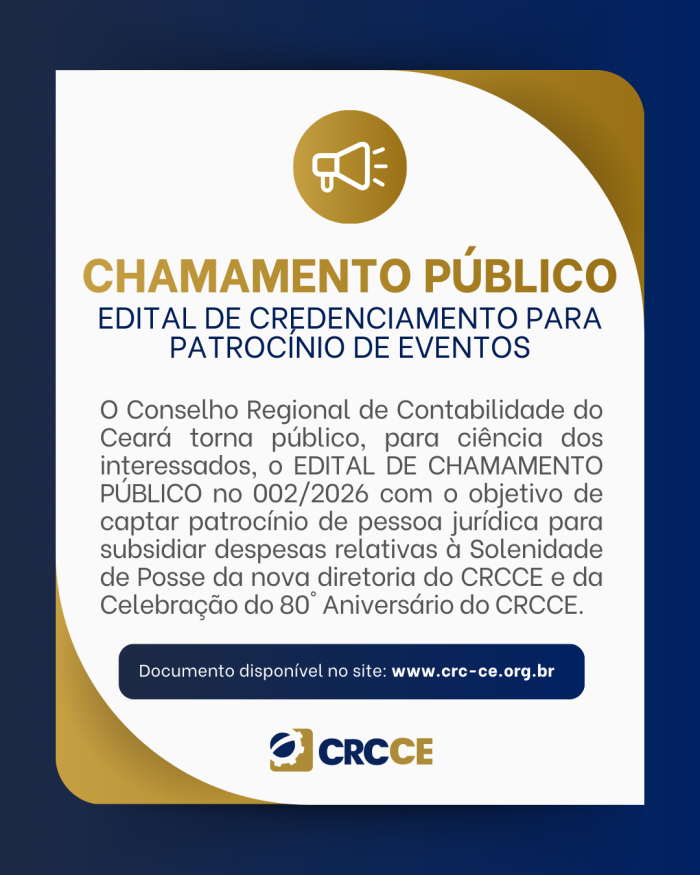 O Conselho Regional de Contabilidade do Ceará (CRCCE) tornou público o Edital de Chamamento Público nº 002/2026, com o objetivo de captar patrocínio de pessoas jurídicas interessadas em subsidiar despesas relacionadas à Solenidade de Posse da nova diretoria do CRCCE e à Celebração do 80º Aniversário da Instituição. O edital é conduzido por intermédio da […]